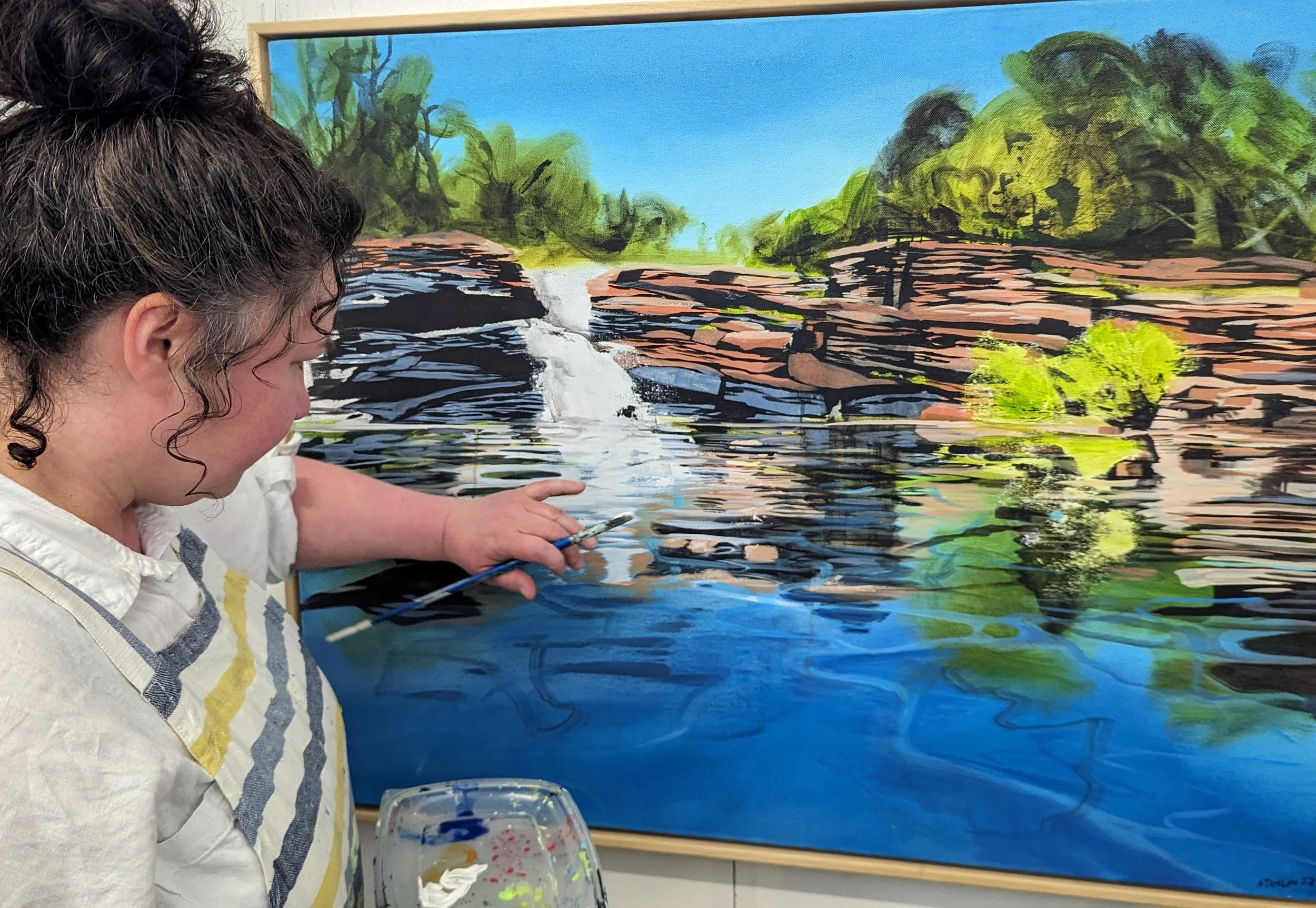 I'm a landscape painter, but memory and intuition are fundamental to my process, I layer paint expressively capturing fleeting moments and memories of places and experiences, thinking about mood, atmosphere and the layers of history. As an outdoor swimmer I especially love the rivers that stitch our towns together and connect them to wilder landscapes beyond. They are my ongoing obsession. I love the symbolism of rivers flowing on forever and connecting past and present.