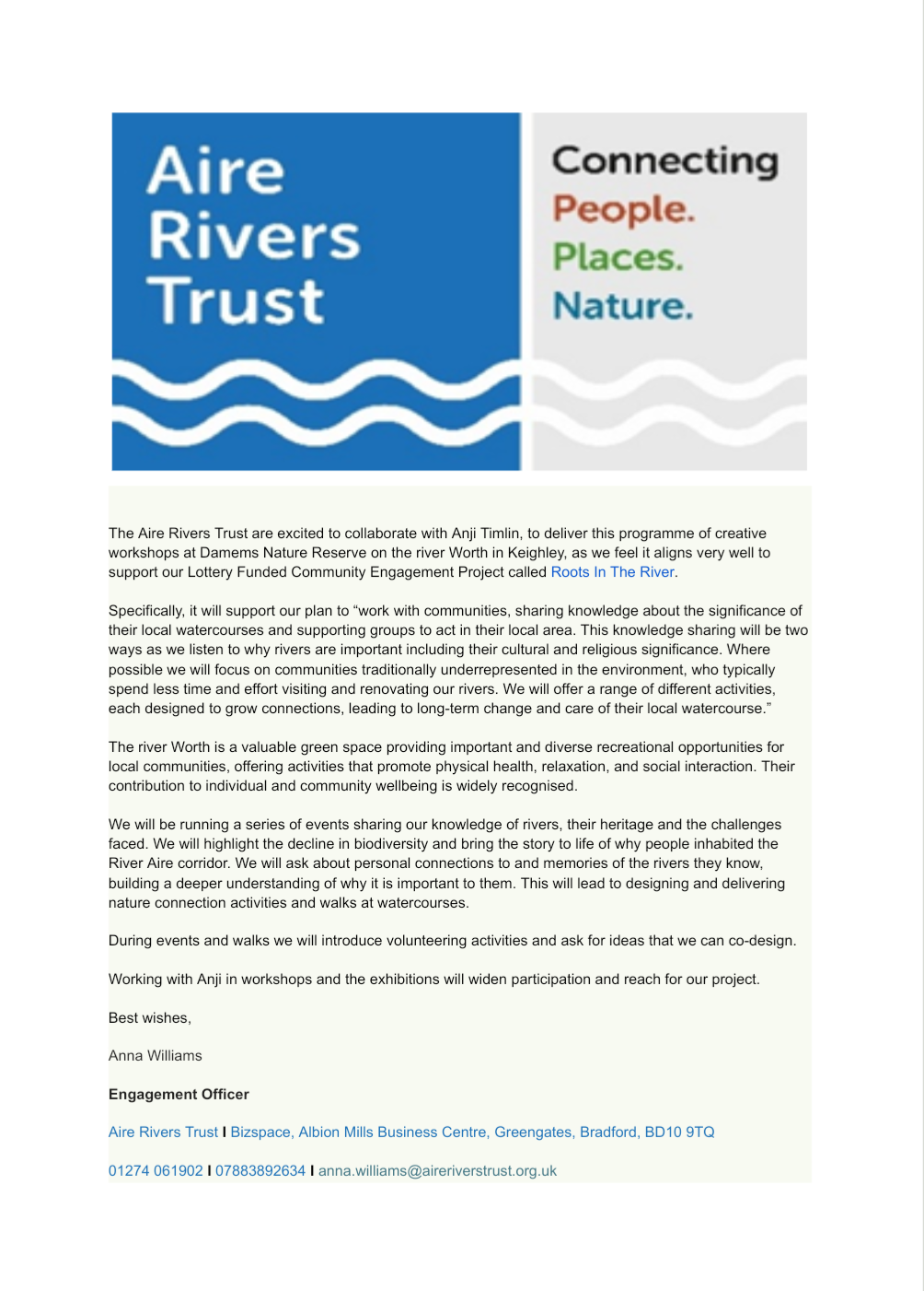 My aim with this project is to make beautiful immersive paintings and create a series of wonderful events and workshops. Together with other river-loving creatives I’ll inspire environmental action, celebrate local histories, and contribute to cultural regeneration in Keighley and Ilkley.